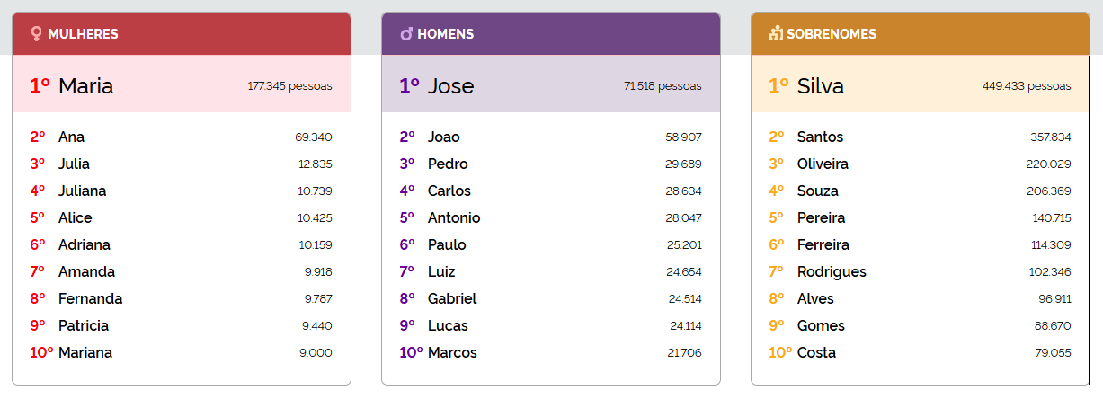 E, no Espírito Santo, não é diferente. De uma população estimada de 4.126.854 habitantes, em 2025, existem 177.345 mulheres que se chamam Maria; 71.518 chamados José e 449.433, com sobrenome Silva.